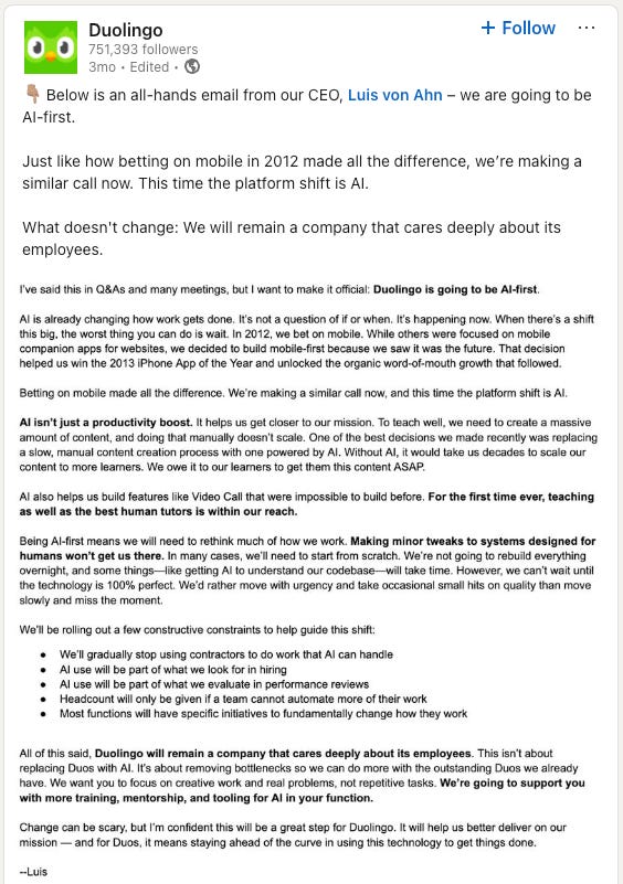 Or Duolingo’s CEO declaring the company would become “AI-first”, with “AI proficiency” influencing hiring and promotions. On paper, it’s an ambitious vision—one that could transform the company if executed with care, transparency, and a genuine focus on user value. But more often than not, moves like this end up as blunt instruments: alienating teams, spooking customers, and reducing AI to a compliance checkbox rather than a catalyst for better outcomes.